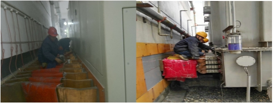 今年,對動力供電系統(tǒng)的濾油和檢修自2016年11月11日開始至2016年12月14日結(jié)束,歷時34天,在車間負(fù)責(zé)人的帶領(lǐng)下,運行各班組按照要求統(tǒng)一協(xié)作,以飽滿的工作熱情與低溫天氣和各種困難作斗爭,將工作重心圍繞在機組濾油和供電系統(tǒng)全面檢修上,他們有條不紊對計劃安排的整流柜銅母線螺栓、一次高壓開關(guān)和刀閘的瓷瓶、保護二次系統(tǒng)的端子排、控制柜進行全面清掃及螺絲緊固,對變壓器進行清洗,同時加強設(shè)備巡視,對濾波系統(tǒng)檢查出的刀閘操作機構(gòu)嚴(yán)重銹蝕,銅鋁過渡連接板開裂等進行了及時處理,認(rèn)真進行消缺,保證了供電安全平穩(wěn)。