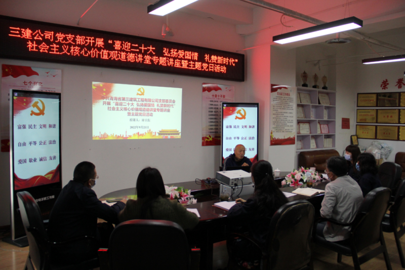 (省三建公司 訊 韓毓、王文杰/文 韓毓/攝 )2022年是黨的二十大召開之年,是落實省第十四次黨代會精神開局之年。為持續(xù)鞏固拓展黨史學(xué)習(xí)教育成果,加強精神文明建設(shè),深化民族團(tuán)結(jié)進(jìn)步宣傳教育和感恩教育,講好各族民族守望相助、團(tuán)結(jié)奮進(jìn)的國企故事,積極培育和踐行社會主義核心價值觀,9月21日,公司黨支部開展“喜迎二十大 弘揚愛國情 禮贊新時代”社會主義核心價值觀道德講堂專題講座暨主題黨日活動。