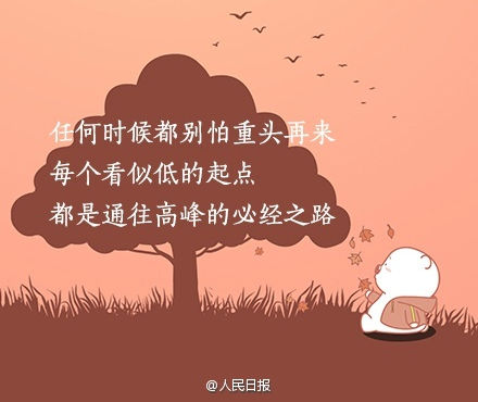 任何時(shí)候都別怕重來(lái),每個(gè)看似低的起點(diǎn),都是通往高峰的必經(jīng)之路。你不努力,誰(shuí)又能替你成長(zhǎng)?來(lái)源:新浪微博@人民日?qǐng)?bào)